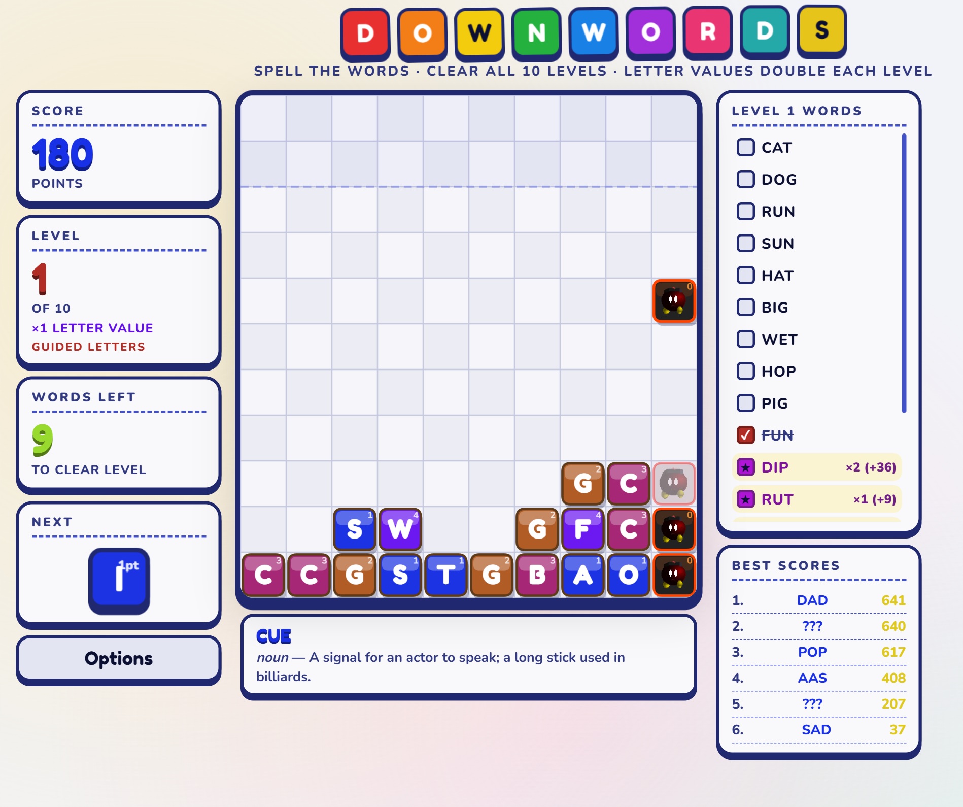 Letter values are multiplied by the current level number, so longer and harder words are worth significantly more in later levels. Spelling bonus words or re-spelling words you have already cleared that level earns bonus points on top of your regular score.